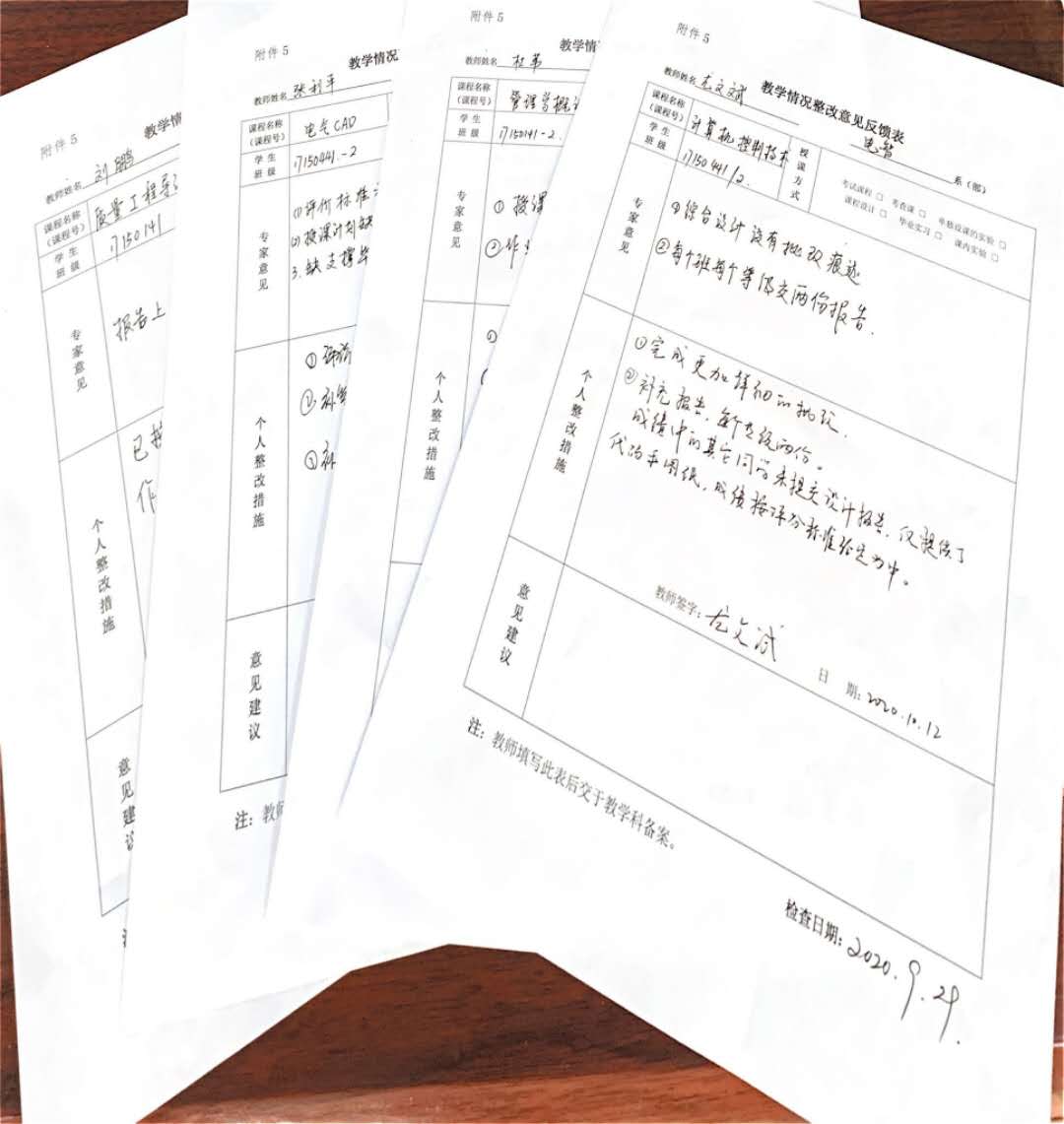随后根据检查情况,教学科老师填写《教学情况整改意见反馈表》并下发给各位老师。各位老师及时认真进行了整改,填写了个人整改措施,收回整改意见反馈表27份。
