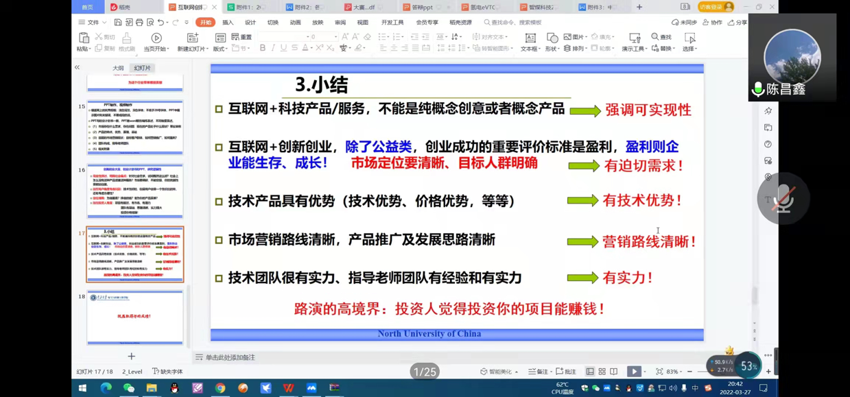 陈昌鑫老师重点从“如何撰写创业计划书”和“如何制作PPT”两个方面为出席会议的师生进行了细致讲解,并对已完成组队的项目,就后续提交材料和答辩工作的展开提出建议;就创业计划书、答辩PPT的制作进行了介绍,为参赛组的工作提了供思路;同时强调项目中要体现可实现性、大众需求性以及技术优势。最后陈昌鑫老师“睿智创新始于心,激情创业践于行。”勉励成人直播