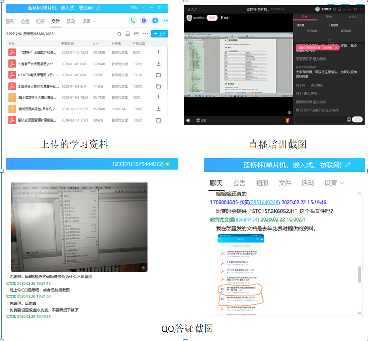 2、制定“蓝桥杯”培训计划,建立了“蓝桥杯”电子类的QQ群,在QQ群中上传硬件开发版、开发环境软件、例程、往年比赛题目,资料下载量基本都在100次左右。采用QQ直播进行培训,并进行QQ在线答疑,期间答疑学生80人次。