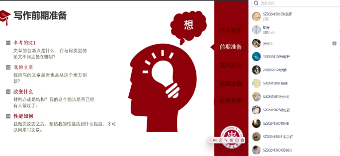 研究生会在腾讯会议举办第20241502期研究生论坛,主题为《高水平论文发表流程与写作经验分享》。此次论坛邀请国家奖学金获得者2022级控制工程专业的畅舒雯和仪器科学与技术专业的曹宇浩作为主讲人,全体研一学生参加。