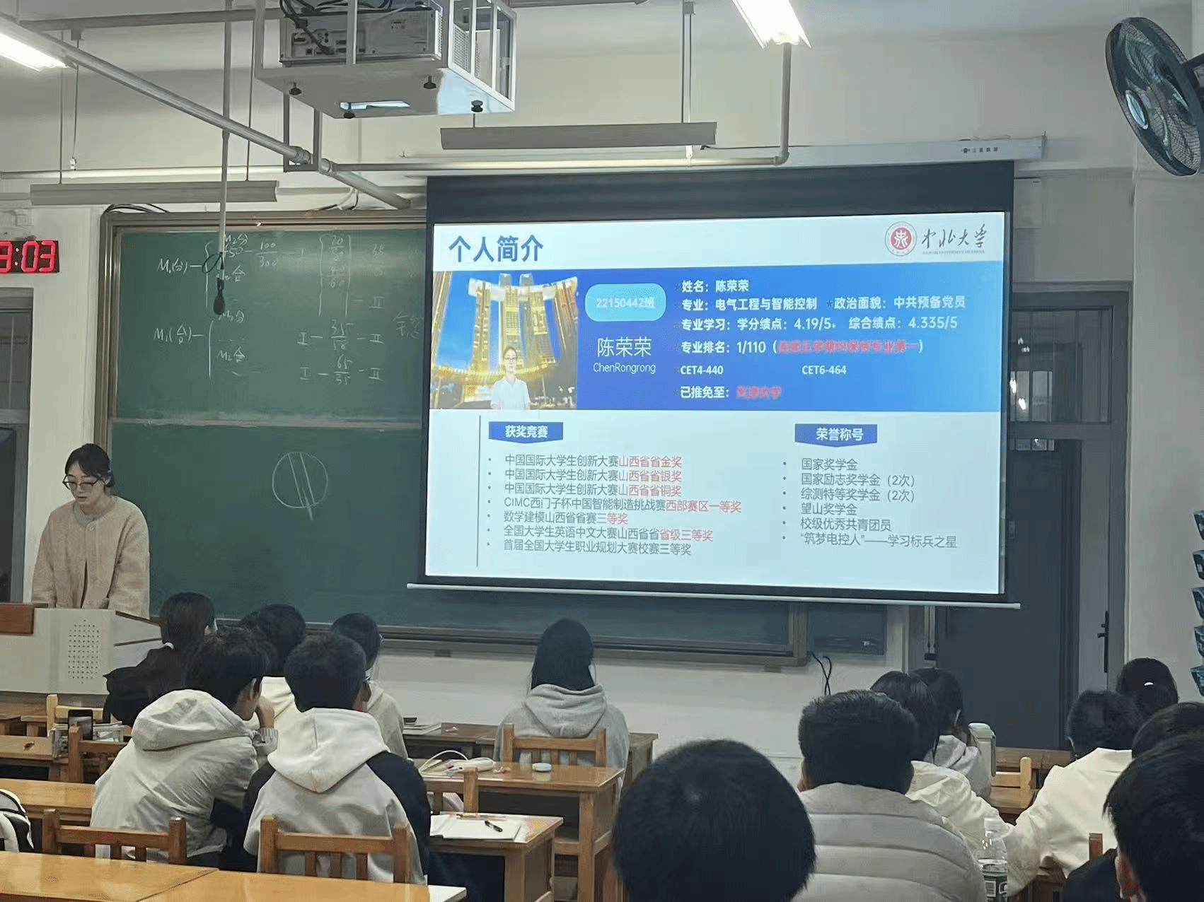 陈荣荣首先强调了成绩的重要性,她叮嘱新生从大一伊始就要端正学习态度,杜绝“摆烂”心理,扎实掌握专业知识,做到不挂科、不重修,为大学学业发展筑牢根基。在能力拓展层面,陈荣荣同学指出英语能力是不可或缺的“硬通货”,鼓励学弟学妹尽早攻克四六级。同时,她建议大家积极投身科研训练及高质量学科竞赛,不仅能锤炼实践能力,还能为个人履历添彩,为未来保研等发展路径积累优势。针对高效学习的方法技巧,陈荣荣同学也倾囊相授。她提出要做好时间分配,通过抓重点实现成绩突破;课堂上要主动靠前就座,专注听讲并做好笔记,以理解式学习降低期末复习压力;此外,重视平时作业、积极向学长学姐求取复习资料等实用技巧,为新生们注入了主动学习、高效学习的动力。
