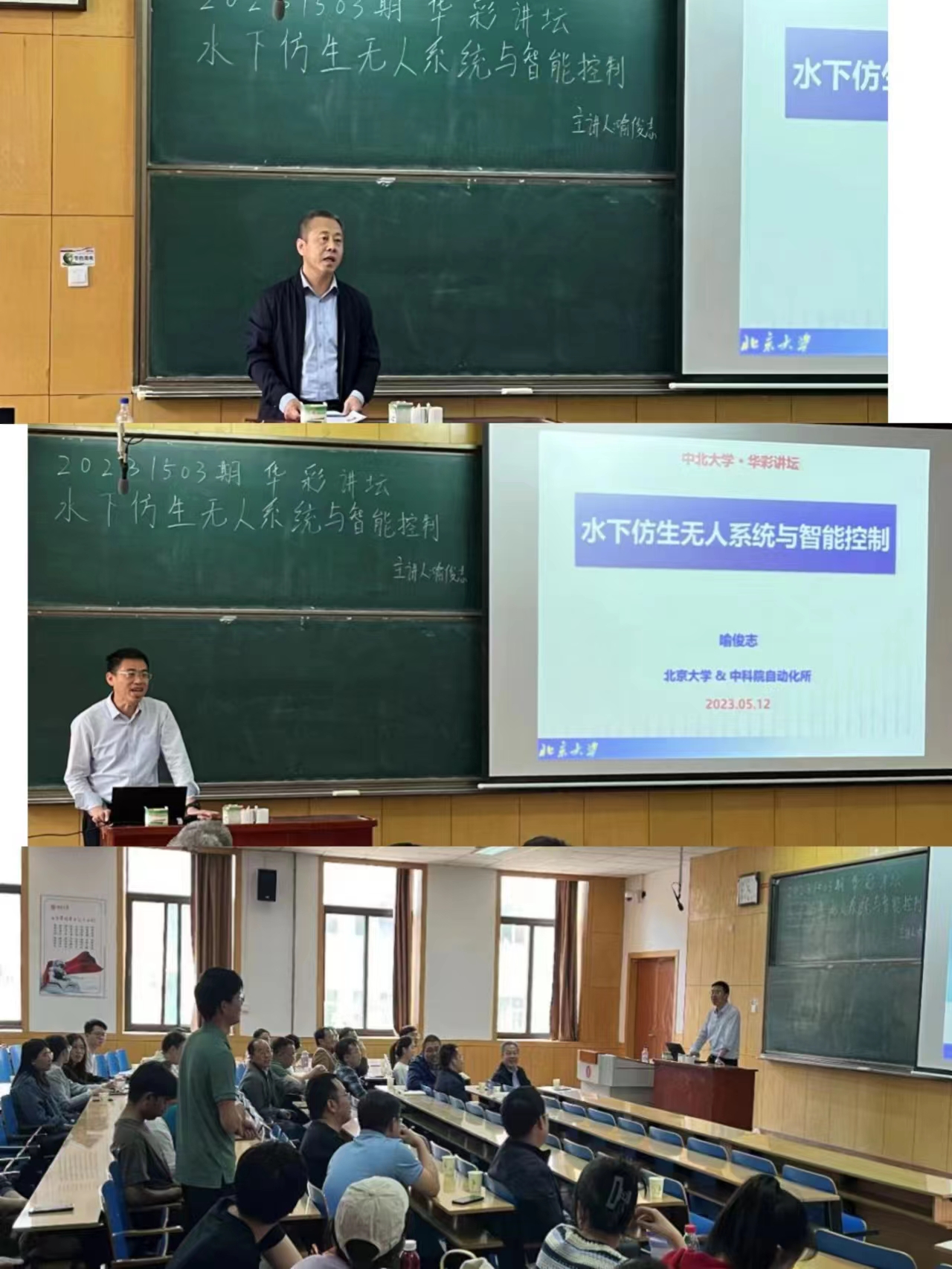 杰出校友北京大学博雅特聘教授喻俊志在11308H教室为广大师生作题为《水下仿生无人系统与智能控制》的学术讲座。喻俊志教授介绍了侧重水下无人潜航器及水下仿生机器人开发与控制研究进展,主要包括鱼类推进机理及高机动仿生实现、海豚建模与仿生技术、水下视觉环境感知及机动型无人监测系统,并对未来研究方向和工作重点进行分析和展望。