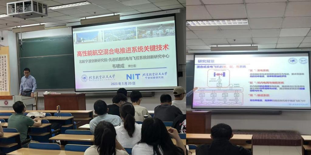 校友北京航空航天大学宁波研究院韦啸成博士作题为《高性能航空混合电推进系统关键技术》的学术讲座。他为研究生介绍了航空混合电推进系统的研究背景,着重讲解了航空混合电推进系统的设计要求、可行方案与解决思路、高性能航空涡轮发电系统等。最后,他对所在的研究院和团队进行介绍、宣讲,欢迎学生们加入他们的团队。同学们积极地与老师进行了互动交流。