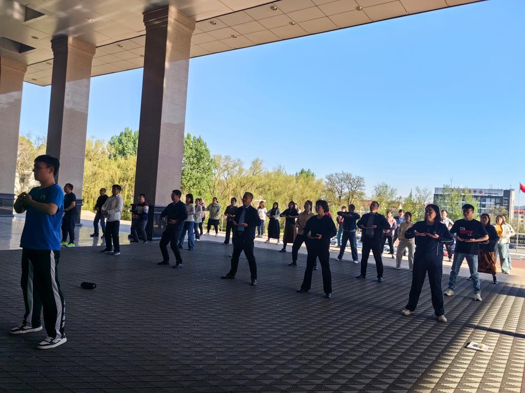 本次活动旨在引导广大教职工通过习练八段锦这一国家级非物质文化遗产、优秀的传统健身功法,达到舒展筋骨、调和气血、改善体质的目的,有效缓解工作压力,提升身心健康水平。活动特别邀请了体育学院两位具有丰富实践经验的硕士研究生担任现场指导。他们耐心细致地讲解了八段锦的动作要领、呼吸配合及习练益处,并进行了标准规范的示范。