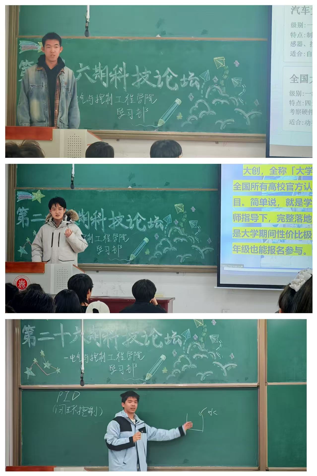 “一苇以航”辅导员工作室在15102H教室成功举办了第二十六期科技讲坛。本次讲坛特邀智能控制创新实验室的王皓喆同学、电气创新实验室的杨嘉康同学和电子设计创新实验室的张时晗同学开讲,围绕竞赛体系、大创项目、PID控制专业知识、备赛技巧及学业规划展开讲解,为学子科创实践与专业学习赋能。