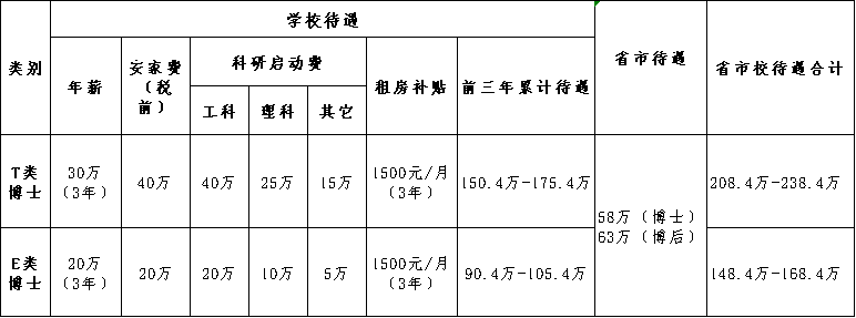 教学科研岗位招聘博士采用综合评价的方式,依据学历背景、学术水平、学院评价划分为T类、E类。T类博士为具备发展为学校核心师资潜力的拔尖博士,E类为加强师资补充的优秀博士。学校为两类博士提供待遇如下: