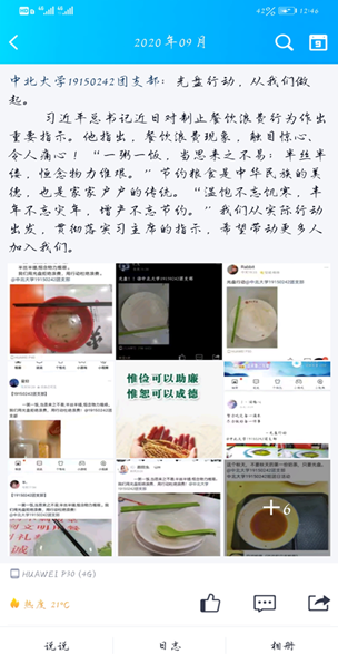 的学子们,也都纷纷行动了起来,每天将自己吃干净的餐盘拍照打卡到网络空间上,以各种各样的形式吸引了大量的关注,同学们相互学习相互竞争,看看谁的餐盘最干净,形成一种良好的氛围,进一步的扩大了“光盘行动“的影响力。