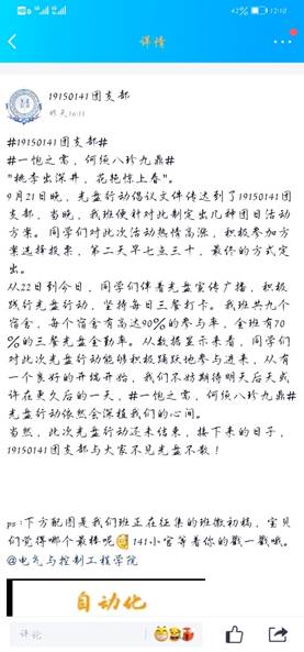 团支部调动青年团员们在班级群、宿舍群里发起公益标语评选活动,评选出许许多多的优秀标语,例如“粮食珍贵,丰俭由人”、“一斤粮,千斤汗,省吃俭用细盘算”、“丰收尤不易,粒米尤珍惜”等等,同学们争相参与,各展风采,将“光盘行动”和文化融合在一起,为活动增添了一抹文艺的色彩,在养成了好习惯的同时提升了同学们的文化水平。
