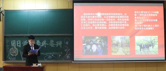 首先是19150242团支部的精彩答辩,他们节约粮食的活动与各种学校风景打卡的活动丰富多彩,答辩员精彩的讲解令台下各个团员皆为他们鼓掌。随后各团支部也都鼓足了劲,在答辩中各展身手。许多团支部的展示着实让人眼前一亮,19150441团支部用相声的方式把团日活动娓娓道来,赢得了无数喝彩;20150404团支部用精美的小视频和音乐细述团日活动的美好与收获,20150504团支部用激昂的诗朗诵方式赞美着母校的辉煌历史,饱满的感情、真挚洪亮的声音令在场嘉宾都无不动容为其喝彩。活动气氛逐渐进入佳境。