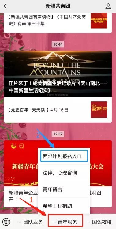 报名方式:2021年普通高等学校应届毕业生或在读研究生可进入“新疆共青团”微信公众号菜单栏,选择“青年服务”中的“西部计划报名入口”(如下图)即可跳转报名官网链接或登录西部计划官网站(//xibu.youth.cn),在西部计划报名系统中进行注册报名。