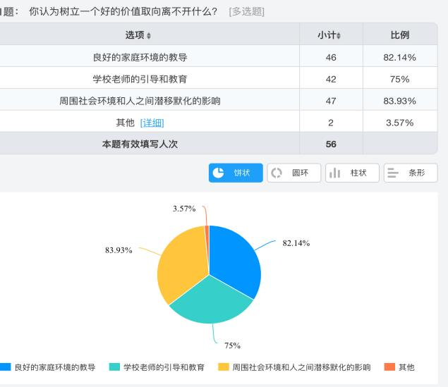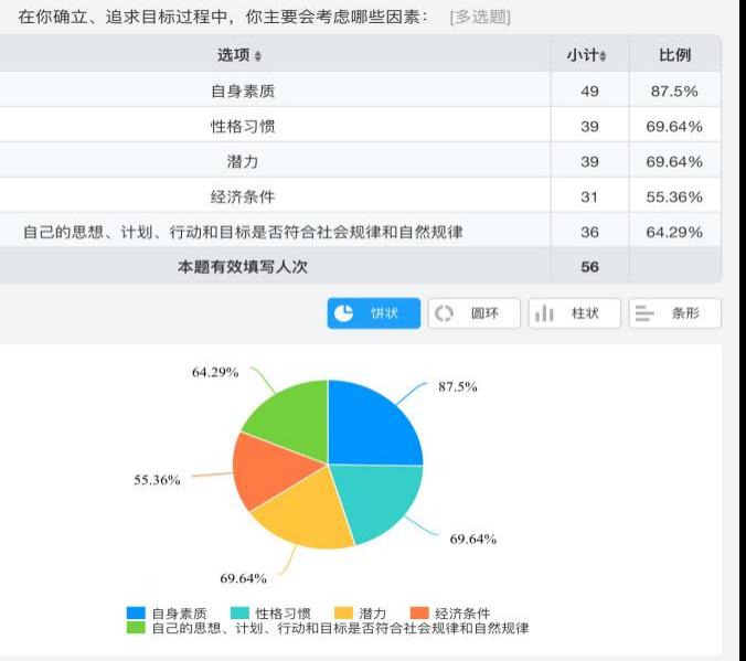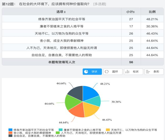 其中,在关于“你认为树立一个好的价值取向离不开什么”的问题中,选择“周围社会环境和人之间潜移默化的影响”和“良好的家庭环境的教导”的分别占83.93%和82.14%;在关于“在社会的大环境下,应该拥有合种价值取向”的问题中,选择“修身齐家治国平天下的社会平等”和“廉者不受嗟来之食的人格平等”的分别占48.21%和30.36%;在关于“你在确立、追求目标的过程中主要会考虑那些因素”的问题中,选择“自身素质”和“经济条件”的分别占87.5%和55.36%。