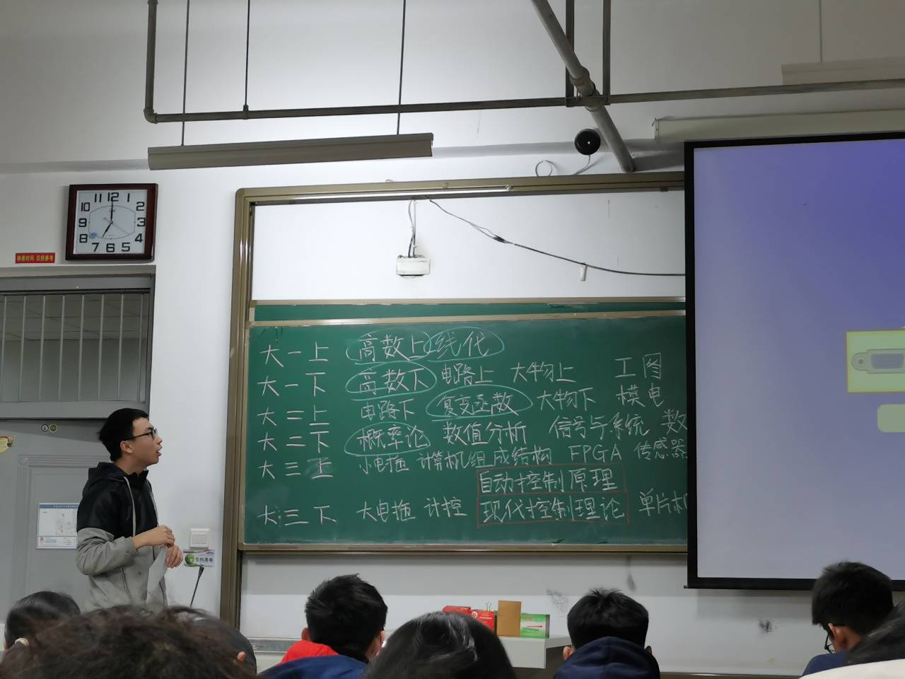 首先,亢早艺学长列出大学四年自动化专业的课程安排,并进行分类讲解和如何进行学习规划,强调了有目标学习的重要性,在此期间,同学们还相互传阅了学长的高数笔记,大家受益匪浅。紧接着亢早艺学长对同学们提出的就业问题进行讲解,同时提到了各种编程语言的学习。之后,学长还向我们介绍了各项大学期间可以参加的竞赛。最后分享了自己的保研经验和考研可以选择的有价值的学校。在整个讲座期间,同学们积极配合并向学长提出自己在初次步入大学生活的各种问题,亢早艺学长也耐心的回答同学们的问题