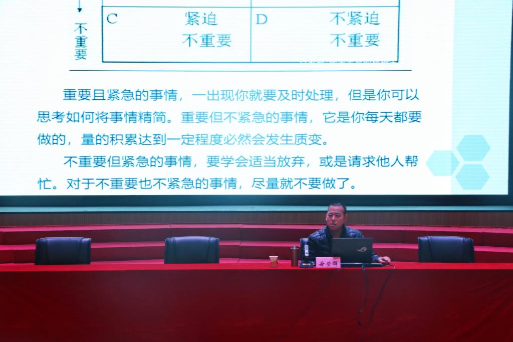 学生处毋登辉老师授课。毋老师以《三全育人背景下的学生干部队伍建设》为题,强调学生干部在不断的学习与锻炼中,形成学生干部的角色意识、合理平衡学习、工作和生活的问题。