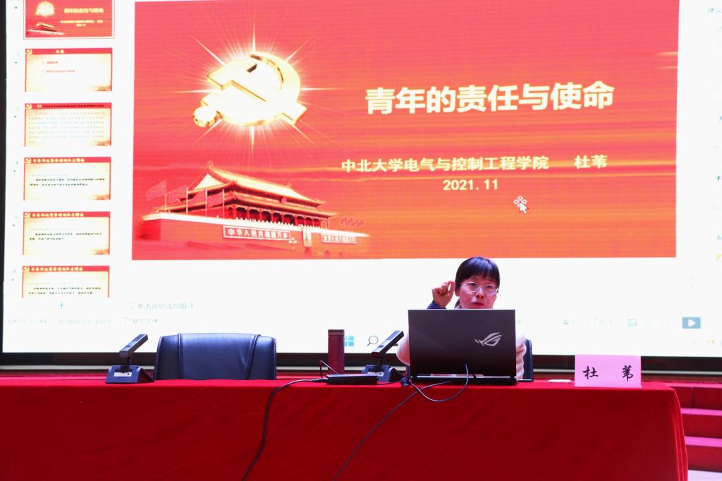 党委副书记杜苇老师授课。杜老师以《青年的责任与使命》为主题,希望学生骨干要坚定理想信念,牢记习近平总书记对广大青年的嘱托:要肩负历史使命,坚定前进信心,立大志、明大德、成大才、担大任,努力成为堪当民族复兴重任的时代新人,让青春在为祖国、为民族、为人民、为人类的不懈奋斗中绽放绚丽之花。